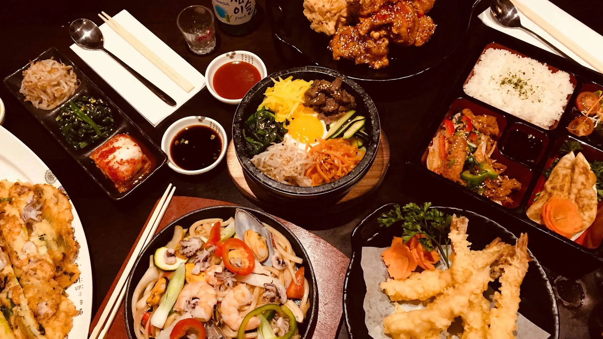Daebak Korean restaurant in London serves classic Korean favourites including fried chicken, rice dishes and noodles in a relaxed, wood clad setting.